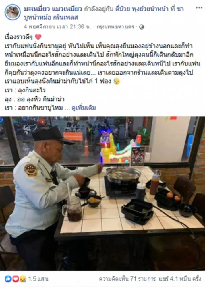 เรียกได้ว่าเป็นเรื่องราวที่มีคนแห่แชร์และต่างเข้ามาแสดงความคิดเห็นกันเป็นจำนวนมาก สำหรับเรื่องราวของคุณลุงยาม ที่มีสาวสวยใจดีเลี้ยงชาบู ผู้ใช้เฟซบุ๊กชื่อ มะเหมี่ยว แมวเหมียว ได้โพสต์ภาพและเรื่องราวสุดประทับใจ หลังจากเธอนั่งกินชาบูอยู่ที่ร้านแห่งหนึ่ง ขณะที่กำลังกินอยู่เธอก็สังเกตเห็น ลุง รปภ.คนหนึ่งที่กำลังทำงานอยู่ ได้มองมาที่เธอหลายครั้ง ก่อนที่เธอและแฟนหนุ่มจะตัดสินใจชวนลุงมาเลี้ยงชาบู แต่ตอนแรกลุงปฏิเสธ เพราะเกรงใจ เธอจึงต้องโกหกว่าเธอถูกหวย จนลุง รปภ.ยอมกิน ก่อนจะขอเบอร์ไว้เพื่อจะเลี้ยงตอบแทนวันหลัง เป็นภาพความสุขที่เธออดนำมาโพสต์ต่อไม่ได้