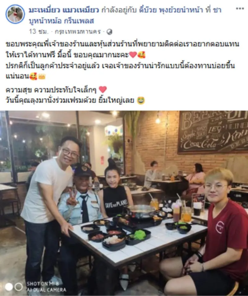 และเธอยังได้โพสต์ต่ออีกว่า ขอบพระคุณพี่เจ้าของร้านและหุ้นส่วนร้านที่พยายามติดต่อเราอยากตอบแทนให้เราได้ทานฟรี มื้อนี้ ขอบคุณมากนะคะ ปรกติก็เป็นลูกค้าประจำอยู่แล้ว เจอเจ้าของร้านน่ารักแบบนี้ต้องทานบ่อยขึ้นแน่นอน