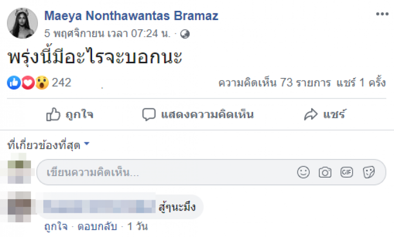 ทั้งนี้เมื่อย้อนดูโพสต์ในเฟซบุ๊กของสาวเมญ่าจะเห็นว่าเธอมีการโพสต์ข้อความคล้ายกำลังมีปัญหาบ้างอย่างเข้ามาในชีวิต นอกจากนี้เธอยังโพสต์อีกว่ารู้สึกโชคดีที่มีเพื่อนเป็นที่ปรึกษา นอกจากนี้เมญ่ายังกล่าวว่าช่วงเวลาที่เลวร้ายเธอไม่ได้สู้เพียงลำพัง และทำให้รู้คุณค่าของความสุขที่เข้ามา