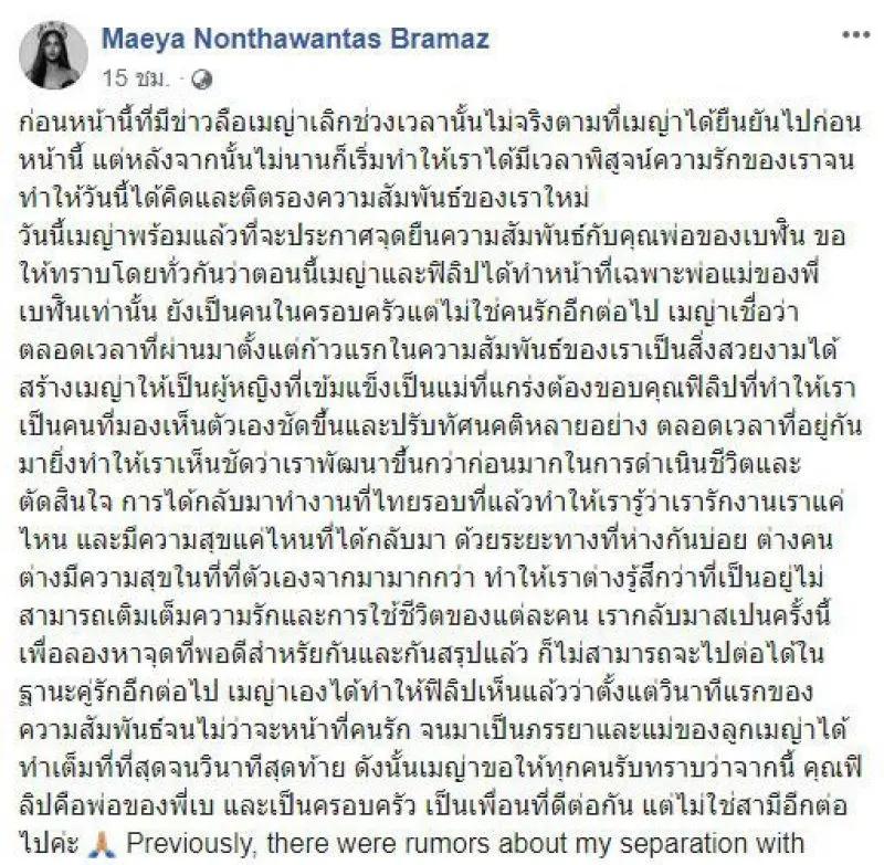 ทั้งนี้ ตนได้ทำให้อดีตสามีเห็นแล้ว ว่าตนได้ทำทุกอย่างอย่างเต็มที่ตั้งแต่วินาทีแรกของความสัมพันธ์ จนวินาทีสุดท้าย อย่างไรก็ตาม ฟิลิปยังคงอยู่ในสถานะพ่อของน้องเบฬิน และยังเป็นคนครอบครัว เป็นเพื่อนที่ดีต่อกัน แต่ไม่ใช่ในฐานะคนรักและสามีอีกต่อไป