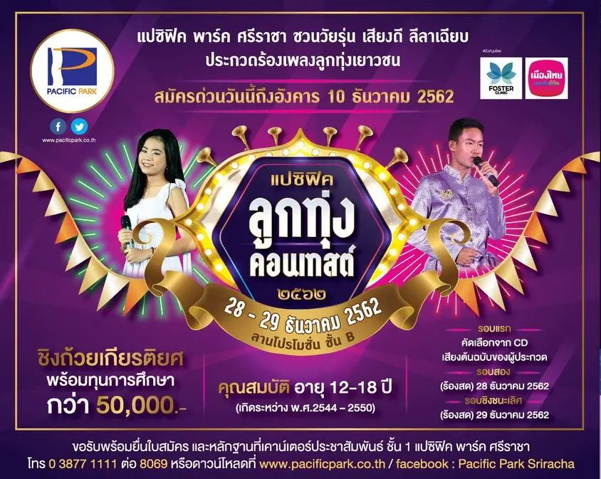 ศูนย์การค้าแปซิฟิค พาร์ค ศรีราชา ขอเชิญชวนเยาวชนที่มีอายุระหว่าง 12 - 18 ปี เข้าร่วมการแข่งขันประกวดร้องเพลงลูกทุ่งเยาวชนชิงถ้วยเกียรติยศ และ ทุนการศึกษากว่า 50,000 บาท ระหว่างวันที่ 28 – 29 ธันวาคม 2562