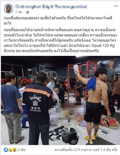 ฝากถึงพวกอีโก้สูงนะครับ ยุกันจังเลย ไหวๆคุณอะไหว แต่เขาไม่ไหวไง อายุแกก็ปาไป 60 กว่าแล้ว ยังจะให้เขามา Squat 120 Kg อีกหรอ ขนาดผมยังหนักเลยครับ ลงไว้เพื่อเป็นอุทาหรณ์นะครับ” โดยผู้โพสต์ได้ระบุเพิ่มเติมว่า ผู้ยกน้ำหนักรายดังกล่าว เกิดอาการช็อกและเสียชีวิต