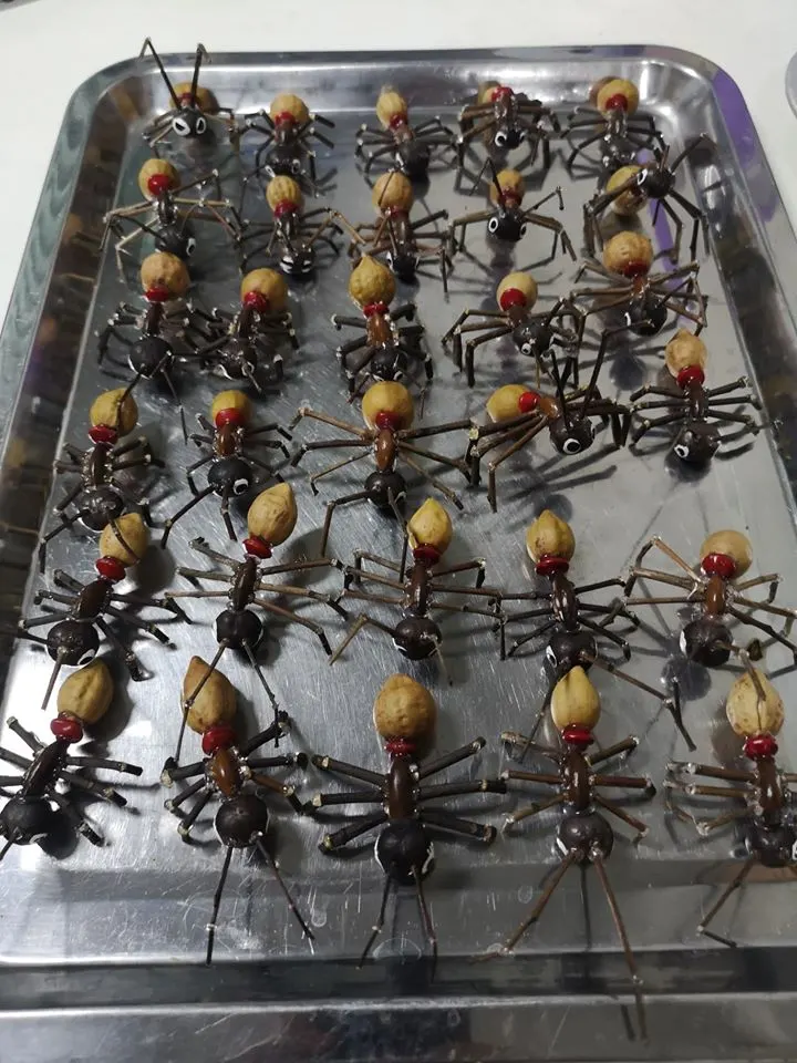 สำหรับตัวมดทำมาจาวัสดุธรรมชาติซึ่งเป็นวัสดุที่หาได้จากภายในมหาวิทยาลัยเกษตรศาสตร์ ได้แก่ เมล็ดไม้ และกิ่งไม้แห้ง ส่วนประกอบต่าง ๆของตัวมด ประกอบด้วย หัว ทำจากเมล็ดเต่าร้าง อก ทำจากเมล็ดพิกุล เอว ทำจากเมล็ดมะกล่ำ ท้อง ทำจากผลพิกุลอบแห้ง ส่วนขาและหนวดทำมาจากเศษกิ่งไม้แห้ง มดทุกตัวทำด้วยแฮนเมด และมดแต่ละตัวจะมีหน้าตาไม่เหมือนกันเป็นเอกลักษณ์ของวัสดุที่ทำจำนวนกว่า 100 กระทง 100 แบบ