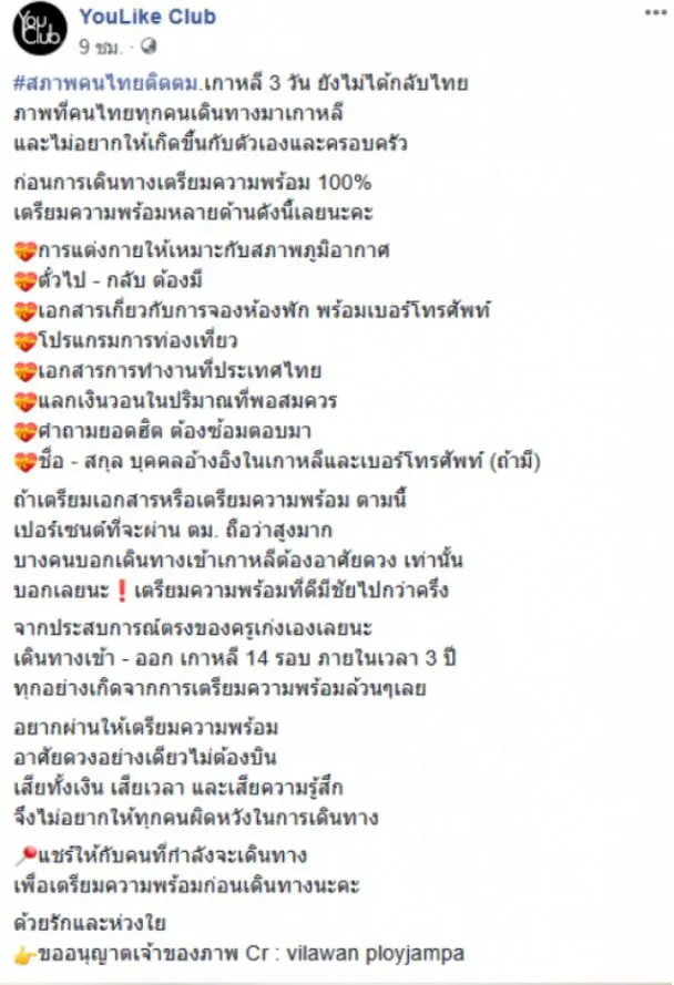 คนไทยจำนวนมาก อยากไปเที่ยวเกาหลี แต่ก็ต้องผิดหวังเมื่อติดอยู่ที่ ตม.กว่าจะได้กลับบ้าน แถมยังเสียค่าเครื่องบินไปสูญเปล่า เมื่อวันที่ 8 พ.ย.2562 เพจ “YouLike Club” ได้โพสต์ข้อความระบุว่า…สภาพคนไทยติดตม.เกาหลี 3 วัน ยังไม่ได้กลับไทย ภาพที่คนไทยทุกคนเดินทางมาเกาหลี และไม่อยากให้เกิดขึ้นกับตัวเองและครอบครัว ก่อนการเดินทางเตรียมความพร้อม 100 เปอร์เซ็น เตรียมความพร้อมหลายด้านดังนี้เลยนะคะ