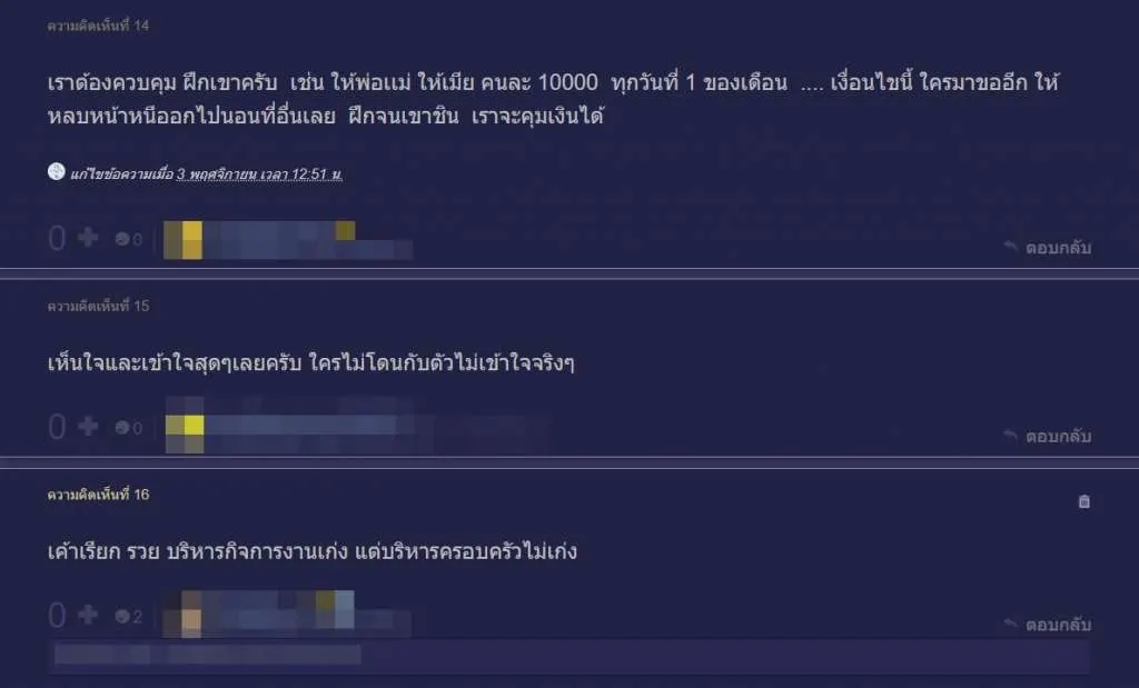 “ทั้งครอบครัวที่ไม่ค่อยทำงานก็จะมาขอเงินตอนป่วยบ้าง ให้ช่วยบ้าง ซึ่งส่วนใหญ่ผมก็ปฏิเสธไป แม้แต่นานๆให้ทีก็ยังหลายตังค์ ครอบครัวนี่หมายถึงพ่อแม่ด้วยนะครับ ไม่ทำการทำงาน หรือทำน้อยคือไม่ทำตั้งแต่หนุ่มๆสาวๆเลยนะครับ บ้านก็ไม่มี รถก็ไม่มี ต้องเช่าเค้า เคยเอามาอยู่ด้วยก็ทำตัวเป็นภาระทำอะไรไม่เป็น แม้แต่โทรสั่งพิซซ่า ต้มมาม่า ทอดไข่ นี่ผมพูดจริงๆ แถมแม่ก็ชอบขโมย กลับมาบ้านวางกระเป๋าตังค์ไว้ ตังค์หายบ่อยมาก เศษเหรียญหายเกลี้ยง”