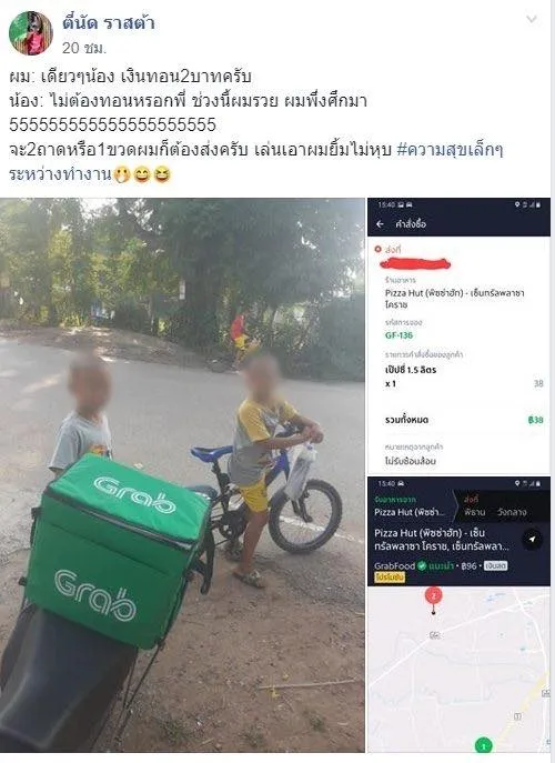 กรณีหนุ่มขี่มอเตอร์ไซค์ส่งเเกร็บ ได้โพสต์ภาพของเด็กชาย 2 คน ขณะที่ตนเองไปส่งอาหารของแกร็บ ที่จังหวัดนครราชสีมา โดยเป็นการส่งน้ำอัดลม 1 ขวด ให้กับลูกค้าซึ่งเป็นเด็กชาย2คนดังกล่าว ก่อนจะเกิดเรื่องราว บทสนทนาขำๆฮาๆ ของหนูน้อย ที่พูดกับหนุ่มขี่เเกร็บ