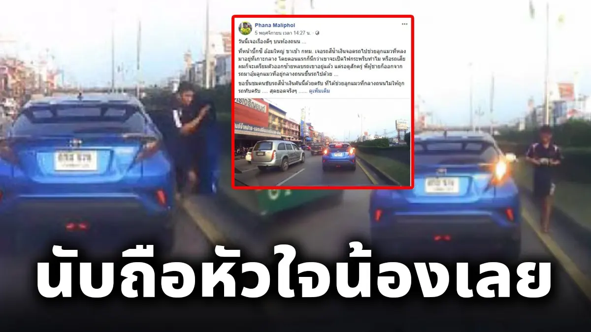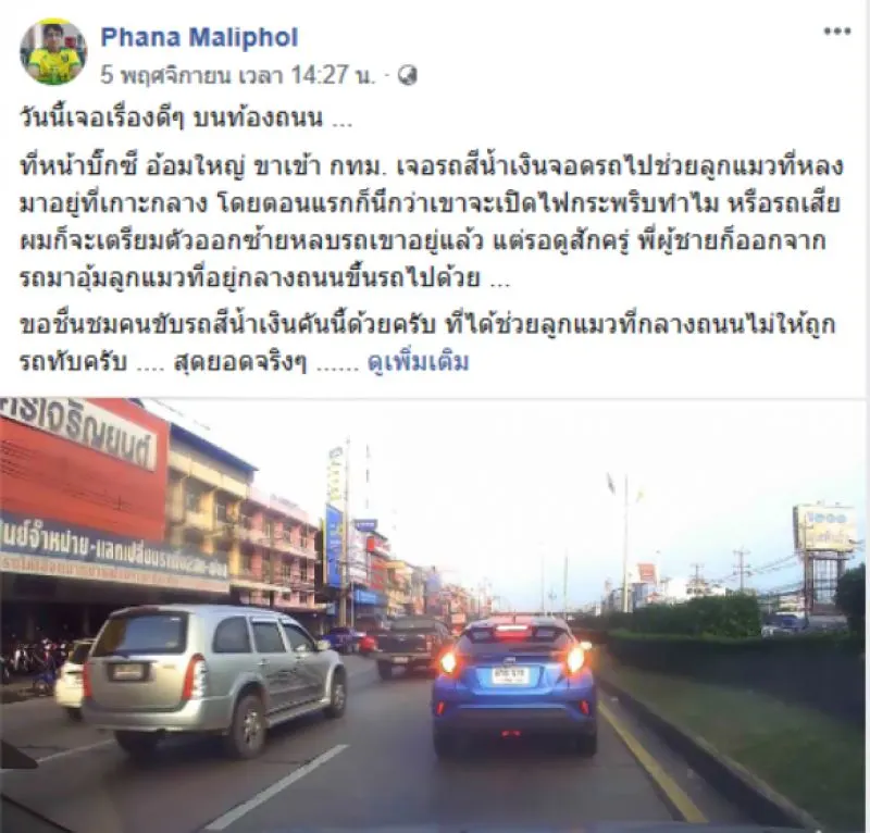 เรียกได้ว่าเป็นคลิป ที่มีการถูกแชร์เป็นจำนวนมากอีกหนึ่งคลิป ที่แพร่ลงบนโลกออนไลน์ โดยสมาชิกผู้ใช้เฟซบุ๊กชื่อ Phana Maliphol ได้โพสต์คลิป และข้อความ เกี่ยวกับเรื่องราวบนถนนที่เขาเจอมา โดยได้ระบุข้อความว่า วันนี้เจอเรื่องดีๆ บนท้องถนน ที่หน้าบิ๊กซี อ้อมใหญ่ ขาเข้า กทม เจอรถสีน้ำเงินจอดรถไปช่วยลูกแมวที่หลงมาอยู่ที่เกาะกลาง โดยตอนแรกก็นึกว่าเขาจะเปิดไฟกระพริบทำไม หรือรถเสีย ผมก็จะเตรียมตัวออกซ้ายหลบรถเขาอยู่แล้ว แต่รอดูสักครู่ พี่ผู้ชายก็ออกจากรถมาอุ้มลูกแมวที่อยู่กลางถนนขึ้นรถไปด้วย ขอชื่นชมคนขับรถสีน้ำเงินคันนี้ด้วยครับ ที่ได้ช่วยลูกแมวที่กลางถนนไม่ให้ถูกรถทับครับ สุดยอดจริงๆ เรื่องดีๆ เราต้องช่วยกันเผยแพร่ครับ
