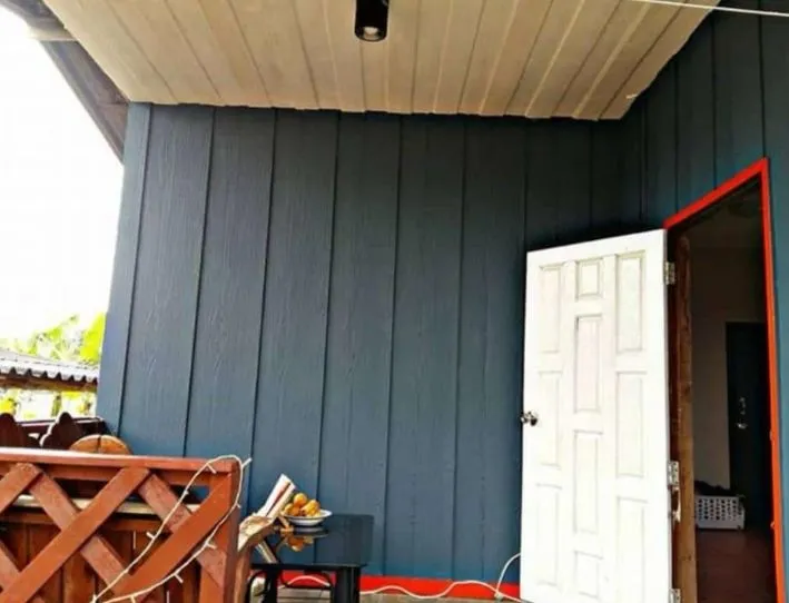 เมื่อเดินขึ้นมาบนบ้านจะพบกับระเบียงนอกบ้านที่มีการจัดโต๊ะรับแขกไว้หน้าบ้านก่อนเข้าประตูไปยังตัวบ้าน ซึ่งบริเวณระเบียงหน้าบ้านนั้นเปิดโล่ง สามารถนั่งพักผ่อนได้อย่างดี ลมพัดผ่านได้อย่างสะดวก ประตูบ้านเป็นประตูไม้ทาด้วยสีขาว เพดานเป็นไม้ทาด้วยสีขาวเช่นกัน มีไฟประดับตรงกลางเพื่อให้ความสว่างภายนอกบ้าน