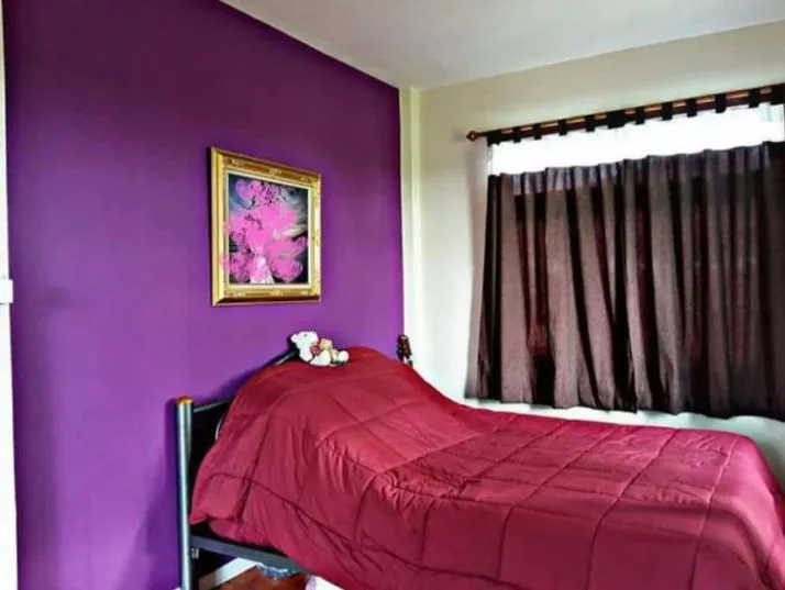 ภายในห้องนอนสามารถวางเตียงได้ 1 เตียง ผนังห้องทาด้วยสีม่วงและอีกฝั่งทาด้วยสีขาว มีรูปภาพมาประดับตกแต่งตามใจผู้อยู่อาศัย หน้าต่างมีม่านสีน้ำตาลกั้น ฝ้าเพดานเป็นฝ้าเรียบธรรมดาทาด้วยสีขาว พื้นห้องทำด้วยไม้ขัดมันทาชแล็คเพิ่มความสวยงามของไม้ และทำให้พื้นบ้านดูสวยขึ้น