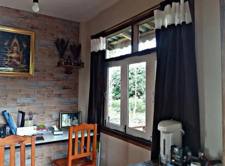 ต่อไปเป็นห้องสำหรับทำงาน อาจจะเป็นห้องที่อยู่ประจำของเจ้าของบ้าน ซึ่งเจ้าของบ้านอาจจะเข้ามาใช้ห้องนี้บ่อยที่สุด เพราะนอกจากจะเป็นห้องที่นั่งทำงานแล้วยังเป็นห้องที่นั่งดื่มกาแฟอีกด้วย ห้องนี้ก็เป็นเหมือนกับห้องทำงานทั่วไป มีหน้าต่างบานพับทาสีขาวเปิดกว้าง มีผ้าม่านสีน้ำตาล บนช่องหน้าต่างเป็นกระจก ผนังห้องติดวอล์เปเปอร์ลายหินมีไฟส่องสว่างให้แก่ห้อง