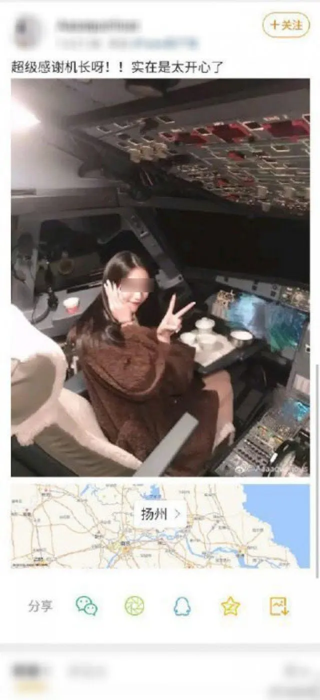 กลายเป็นที่ฮือฮาอย่างมาก เมื่อโลกอนไลน์ของจีนได้พูดถึงภาพถ่ายของนกศึกษาสาวชาวจีนรายหนึ่ง ที่เข้าไปนั่งถ่ายภาพบนเก้าอี้นักบิน โพสต์ท่าชูสองนิ้ว ด้านหน้ามีชุดน้ำชาวางอยู่ กับคำบรรยายว่า "ขอบคุณกัปตันอย่างที่สุด ฉันดีใจมากเลย" โดยภาพดังกล่าวนั้นกลายเป็นที่วิพากษ์วิจารณ์เนื่องจากว่าเธอได้นั้งบนเก้าอี้นักบิน ขณะที่กำลังบินอยู่
