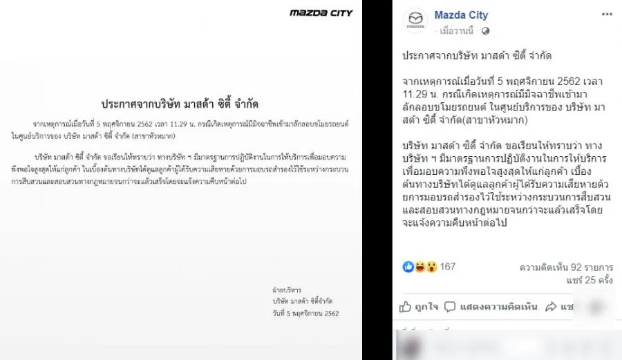จนในที่สุด ทางเพจ Mazda City ได้โพสต์ข้อความชี้แจงว่า “ประกาศจากบริษัท มาสด้า ซิตี้ จำกัด จากเหตุการณ์เมื่อวันที่ 5 พฤศจิกายน 2562 เวลา 11.29 น. กรณีเกิดเหตุการณ์มีมิจฉาชีพเข้ามาลักลอบขโมยรถยนต์ ในศูนย์บริการของ บริษัท มาสด้า ซิตี้ จำกัด(สาขาหัวหมาก)