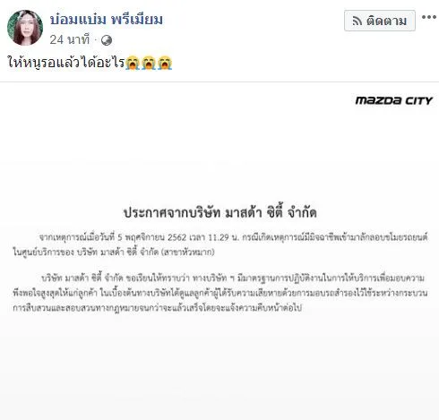บริษัท มาสด้า ซิตี้ จำกัด ขอเรียนให้ทราบว่า ทางบริษัท ฯ มีมาตรฐานการปฏิบัติงานในการให้บริการเพื่อมอบความพึงพอใจสูงสุดให้แก่ลูกค้า เบื้องต้นทางบริษัทได้ดูแลลูกค้าผู้ได้รับความเสียหายด้วยการมอบรถสำรองไว้ใช้ระหว่างกระบวนการสืบสวนและสอบสวนทางกฎหมายจนกว่าจะแล้วเสร็จโดยจะแจ้งความคืบหน้าต่อไป”
