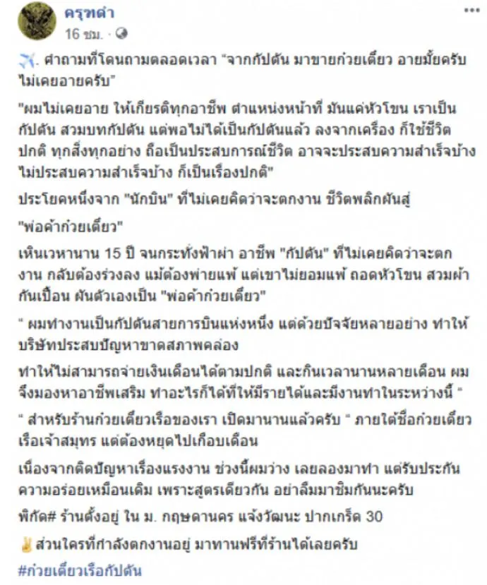 ประโยคหนึ่งจาก นักบิน ที่ไม่เคยคิดว่าจะตกงาน “ชีวิตพลิกผันสู่ พ่อค้าก๋วยเตี๋ยว”