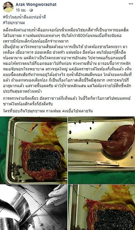 โดยได้โพสท์ระบุว่า #นิ่วในถุงน้ำดีและท่อน้ำดี #ไข่มุกชานม ตะลึงหลังผ่าเอาถุงน้ำดีออก เจอก้อนนิ่วเหมือนไข่มุกสีดำที่เป็นอาหารยอดฮิตใส่ในชานม กาแฟนมประเภทต่างๆ นับได้กว่า800 ก้อนจนเบื่อที่จะนับต่อ เพราะมีก้อนเล็กก้อนน้อยอีกจำนวนมาก