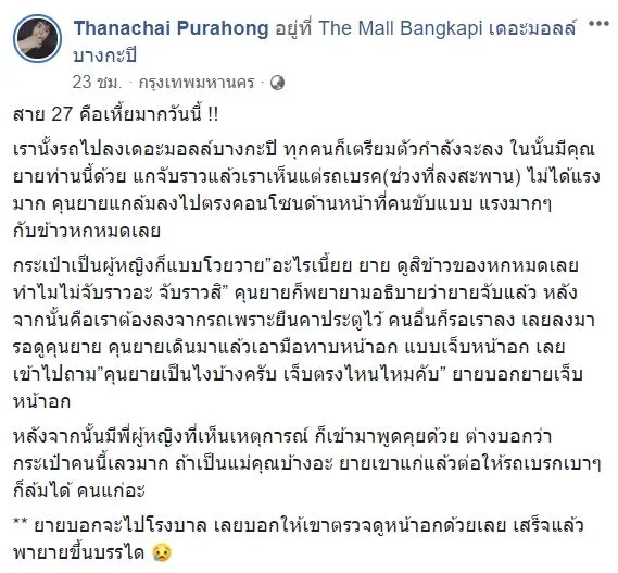 ผู้ใช้เฟซบุ๊คโพสต์ข้อความระบุว่า “สาย 27 คือxxxมากวันนี้!! เรานั่งรถไปลงเดอะมอลล์บางกะปิ ทุกคนก็เตรียมตัวกำลังจะลง ในนั้นมีคุณยายท่านนี้ด้วย แกจับราวแล้วเราเห็นแต่รถเบรค(ช่วงที่ลงสะพาน) ไม่ได้แรงมาก คุนยายแกล้มลงไปตรงคอนโซนด้านหน้าที่คนขับแบบ แรงมากๆ กับข้าวหกหมดเลย”