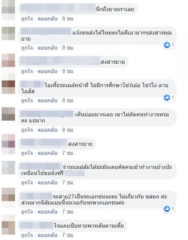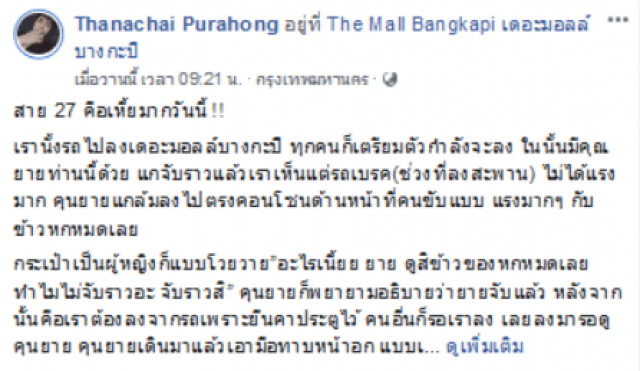 เรียกได้ว่าเป็นเรื่องราวที่ถูกแชร์ เป็นจำนวนมากบนโลกออนไลน์อีกเรื่อง เมื่อเพจผู้ใช้เฟซบุ๊กชื่อ Thanachai Purahong ได้โพสต์เรื่องราวของ คุณป้า ท่านหนึ่ง ที่เรื่องราวเกิดขึ้นบนรถเมย์ และล้มบนรถ แล้วทำกับข้าวหกบนรถ ก่อนถูกพนักงานด่าซ้ำ โดยได้ระบุข้อความว่า สาย 27 คือเฮียมากวันนี้ เรานั้งรถไปลงเดอะมอลล์บางกะปิ ทุกคนก็เตรียมตัวกำลังจะลง ในนั้นมีคุณยายป้า ท่านนี้ด้วย แกจับราวแล้วเราเห็นแต่รถเบรค ช่วงที่ลงสะพาน ไม่ได้แรงมาก คุณป้า แกล้มลงไปตรงคอนโซนด้านหน้าที่คนขับแบบ แรงมากๆ กับข้าวหกหมดเลย กระเป๋าเป็นผู้หญิงก็แบบโวยวาย อะไรเนี้ย ป้า ดูสิข้าวของหกหมดเลย ทำไมไม่จับราวอะ จับราวสิ คุณป้าก็พยายามอธิบายว่าป้าจับแล้ว
