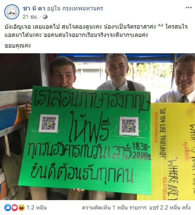 ผู้ใช้เฟสบุ๊คที่ใช้ชื่อว่า ชา นิ ดา โดยได้โพสต์ภาพพร้อมระบุข้อความว่า บังเอิญเจอ เลยแอดไป สนใจลองดูนะคะ น้องๆเป็นจิตรอาสาค่ะ ใครสนใจแอดมาได้นะคะ ขอคนสนใจอยากเรียนจริงๆจะดีมากๆเลยค่ะ