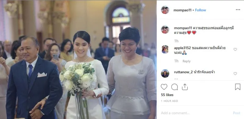 เเละล่าสุด ทางด้านของ คุณแม่เปาวลี นั้นก็โพสต์เเล้ว หลังลูกสาว ได้เเต่งงานกับลูกป๋ากิ๊ก ขึ้นแท่นสะใภ้ทายาทพันล้าน โดยหลังงานเเต่งงาน คุณแม่ของ สาวเปาวลี นั้นก็ได้โพสต์รูปภาพพร้อมระบุข้อความว่า