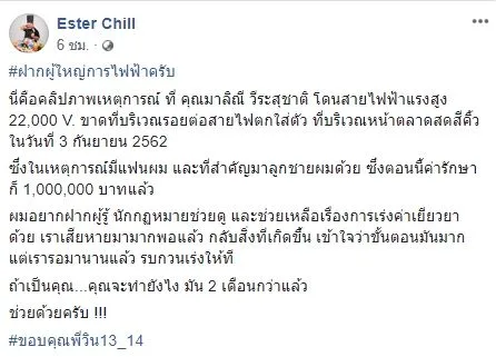 โดยเจ้าของเฟซบุ๊ก Ester Chill ได้โพสตทั้งภาพและคลิป เพื่อขอความช่วยเหลือความว่า “ฝากผู้ใหญ่การไฟฟ้าครับ นี่คือคลิปภาพเหตุการณ์ ที่ คุณมาลิณี วีระสุชาติ โดนสายไฟฟ้าแรงสูง 22,000 V. ขาดที่บริเวณรอยต่อสายไฟตกใส่ตัว ที่บริเวณหน้าตลาดสดสีคิ้ว ในวันที่ 3 กันยายน 2562