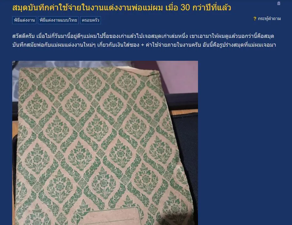 สวัสดีครับ เมื่อไม่กี่วันมานี้อยู่ดีๆแม่ผมไปรื้อของเก่าแล้วไปเจอสมุดเก่าเล่มหนึ่ง เขาเอามาให้ผมดูแล้วบอกว่านี้คือสมุดบันทึกสมัยพ่อกับแม่ผมแต่งงานใหม่ๆ เกี่ยวกับเงินใส่ซอง + ค่าใช้จ่ายภายในงานครับ อันนี้คือรูปร่างสมุดที่แม่ผมเจอมา