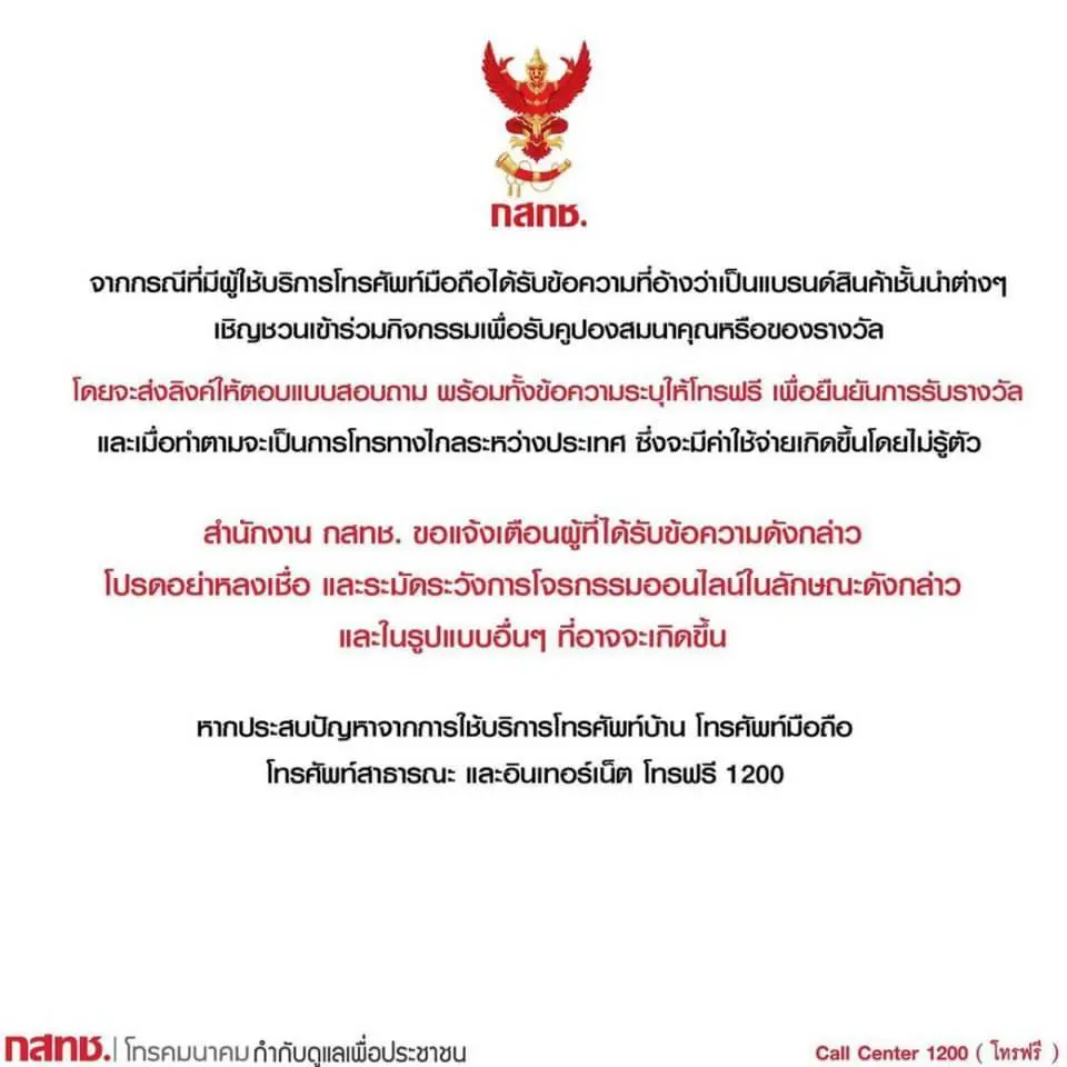 กสทช. หรือคณะกรรมการกิจการกระจายเสียง และกิจการโทรทัศน์ และกิจการโทรคมนาคมแห่งชาติ ออกมาเตือนกรณีที่ที่ระยะหลัง มีคนได้รับข้อความอ้างว่าเป็นสินค้าแบรนด์ดัง หรือร้านค้า ชวนให้ร่วมกิจกรรม แล้วจะได้รับของรางวัล หรือกินอาหารในร้านฟรี
