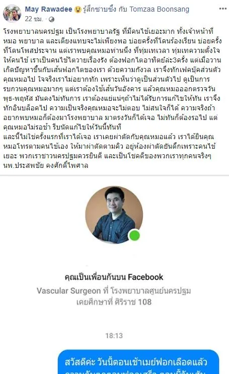 เจ้าของเฟซบุ๊ก May Rawadee เล่าว่า โรงพยาบาลนครปฐม เป็นโรงพยาบาลรัฐ ที่มีคนไข้เยอะมาก ทั้งเจ้าหน้าที่ หมอ พยาบาล และเตียงแทบจะไม่เพียงพอ บ่อยครั้งที่โดนร้องเรียน บ่อยครั้งที่โดนโพสประจาน แต่เราพบคุณหมอท่านนึง ที่ทุ่มเทเวลา ทุ่มเทความตั้งใจให้คนไข้ เราเป็นคนไข้ไตวายเรื้อรัง ต้องฟอกไตอาทิตย์ละ3ครั้ง