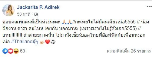 ด้าน Jackarita P. Adirek โพสต์ข้อความระบุว่า ขอบคุณทุกคนที่เป็นห่วงนะคะ //กะเทยไม่ได้มีคนเดียวเน้อ5555 // น้องฝึกงาน ดารา คนไหน เคยกิน บอกมานะ (เพราะเรายังไม่รู้ตัวเลย5555) //แหม!!!!!!!! ถ้าสวยขนาดนั้น ไม่มานั่งเชียร์บอลไทยที่อ๊อฟฟิศกับเพื่อนหรอกเน้อ #Thailandสู้ๆ