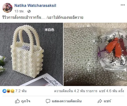 สาวเจ้าของเฟซบุ๊ก Natika Watcharasaksil โพสต์รีวิวสั่งกระเป๋าจากจีน โดยสิ่งที่เธอได้รับเป็นชุดงานประดิษฐ์ประกอบด้วยลูกปัดจำนวนมากและชุดเข็ม เส้นด้าย เส้นเอ็น ให้เอามาถักเป็นกระเป๋าเอง