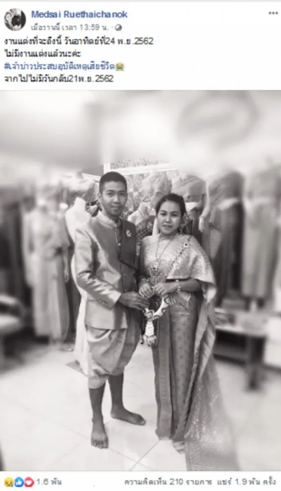 เรียกได้ว่าเป็นอีกหนึ่งเหตุการณ์ที่โซเชียเข้ามาแสดงความเสียใจกันเป็นจำนวนมาก หลังมีผู้ใช้เฟสบุ๊คชื่อ Medsai Ruethaichanok ได้ออกมาโพสต์ภาพลองชุดบ่าวสาวคู่กับแฟนหนุ่มพร้อมได้ระบุข้อความว่า