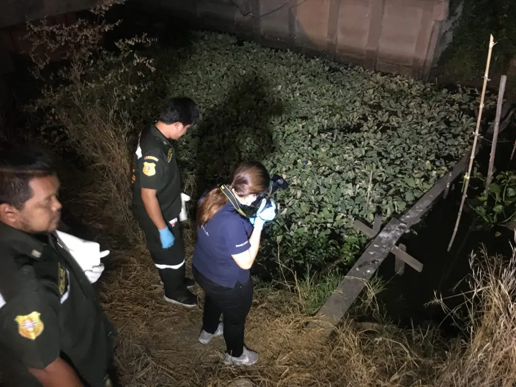 ที่เกิดเหตุพบร่างของชายอายุประมาณ 25 ปี ลักษณะลำตัวท่อนบนตั้งแต่เอว ไปถึงศรีษะจมอยู่ในน้ำ ท่อนล่างโผล่ขึ้นมาพาดอยู่ริมตลิ่ง สวมใส่เสื้อยืดแขนสั้นสีดำ กางเกงยีนส์ขาสั้นเขียว และยังพบรถ จยย.ยี่ห้อ ฮอนด้า รุ่นเวฟ สีน้ำเงิน-ดำ ทะเบียน 9กย 3542 กทม จอดอยู่ริมถนนซึ่งเป็นของผู้เสียชีวิตภายในรถพบบัตรประจำตัวประชาชนระบุชื่อ นายพรชัย เมียดเตียบ อายุ 25 ปี ชาว จ.บุรีรัมย์ ขณะเดียวกันทางแพทย์เวรตรวจสอบเบื้องต้นไม่พบบาดแผลหรือร่องรอยการถูกทำร้ายเสียชีวิตมาแล้วประมาณ 3 ช.ม.