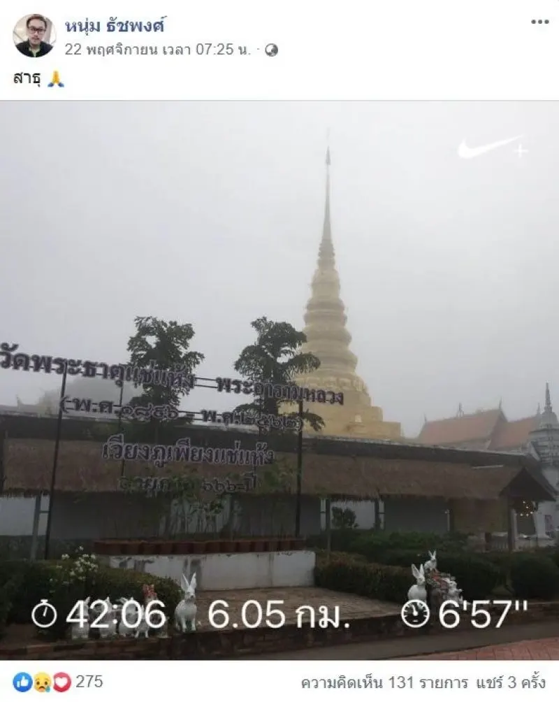 ล่าสุดวันที่ 24 พ ย จากการตรวจสอบเฟซบุ๊ก หนุ่ม ธัชพงศ์ พบว่าเพียงไม่กี่ชั่วโมงก่อนเกิดอุบัติเหตุ นายธัชพงศ์ได้โพสต์ภาพที่วัดพระธาตุแช่แห้ง ในพื้นที่ ม 3 บ้านหนองเต่า ต ม่วงตี๊ด อ ภูเพียง จ น่าน พร้อมข้อความสั้นๆ ว่า สาธุ