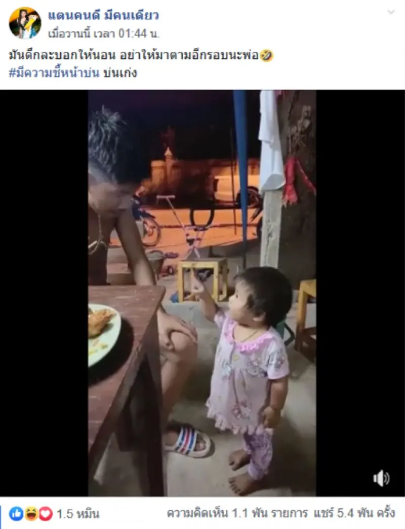 วันที่ 24 พฤศจิกายน 2562 ทีมงานรายงานว่า โลกออนไลน์มีการบอกต่อคลิปวิดีโอของผู้ใช้เฟซบุ๊กชื่อ แตนคนดี มีคนเดียว ซึ่งได้โพสต์คลิปของหนูน้อยที่ออกมาตามพ่อให้ไปนอน โดยผู้ใช้เฟซบุ๊กดังกล่าวระบุข้อความว่า มันดึกละบอกให้นอน อย่าให้มาตามอีกรอบนะพ่อ