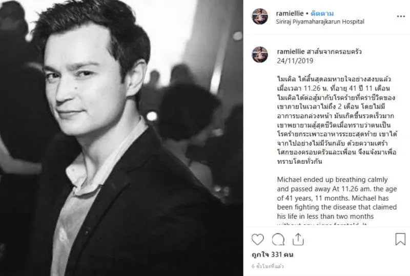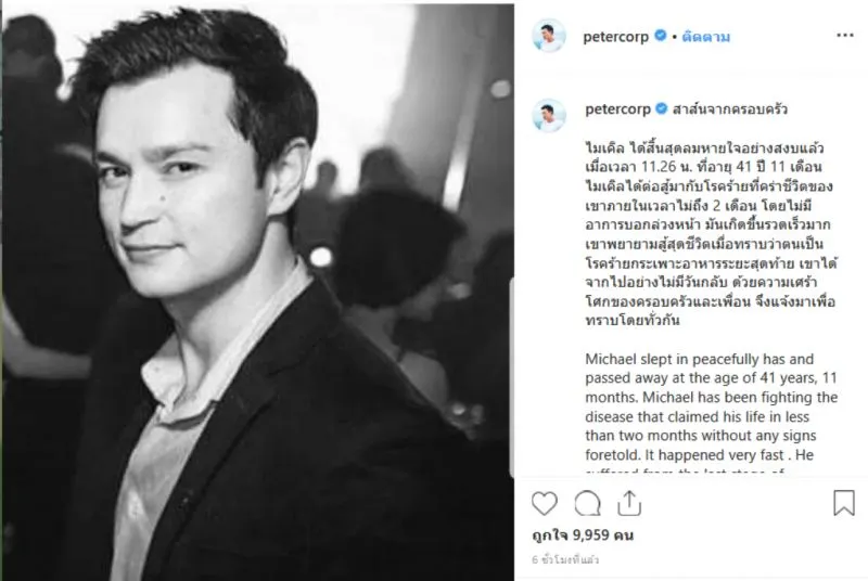 จากกรณีที่ผู้ใช้อินสตาแกรมชื่อ petercorp หรือที่เรารู้จักกันดีในนาม ปีเตอร์ คอร์ป ไดเรนดัล ได้โพสต์ภาพและข้อความสุดอาลัย ที่ต้องสูญเสียน้องชาย ไมเคิล ไปด้วยวัย 41 ปี จากโรคมะเร็งกระเพาะอาหารระยะสุดท้าย โดยเจ้าตัวระบุข้อความว่า