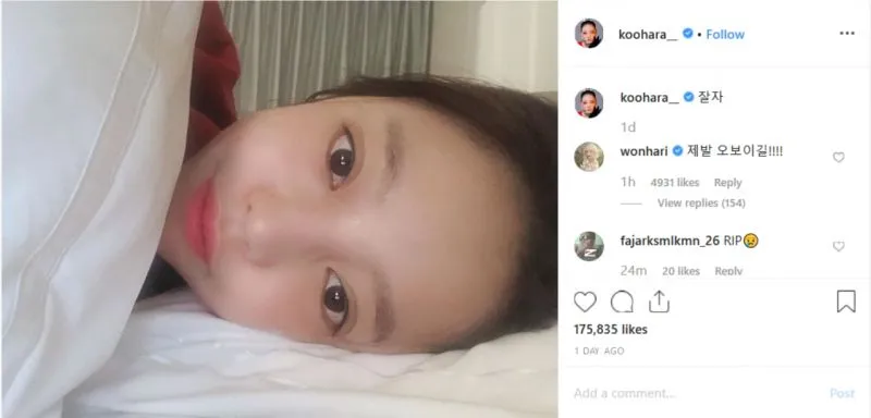 ซึ่งหลังจากได้ไปติดตามอินสตาแกรมส่วนตัวของเธอพบว่า เมื่อศุกร์ที่ผ่านมาหรือ 2 วันก่อนเสียชีวิตในวันนี้ เธอได้ดพสต์รูปเซลฟี่ที่ตนกำลังนอนตะแคงอยู่บนเตียง สวมเสื้อสีแดง และหันหน้าเข้าหากล้องในระยะใกล้ มีคำบรรยายสั้นๆ เป็นภาษาเกาหลี ว่า 잘자 หรือ ฝันดีนะ