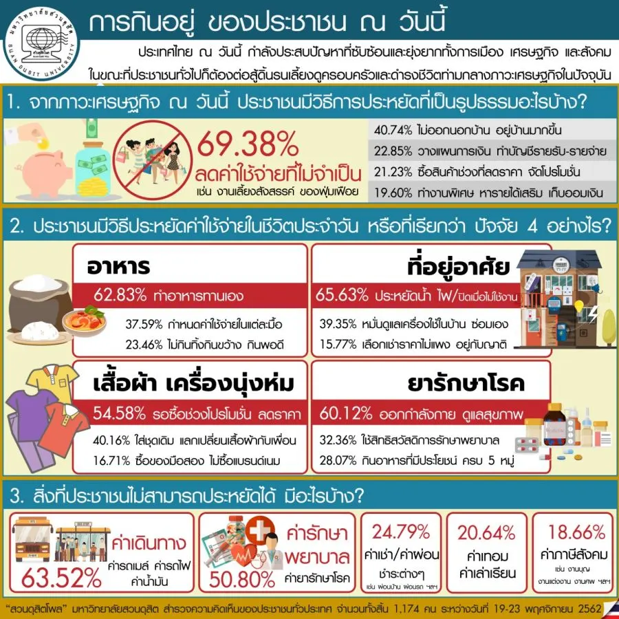 ประเทศไทย ณ วันนี้ กำลังประสบปัญหาที่ซับซ้อนและยุ่งยากทั้งการเมือง เศรษฐกิจ และสังคม ในขณะที่ ประชาชนทั่วไปก็ต้องต่อสู้ดิ้นรนเลี้ยงดูครอบครัวและดำรงชีวิตท่ามกลางภาวะเศรษฐกิจในปัจจุบัน เพื่อสะท้อนความ คิดเห็นของประชาชนที่มีต่อการดำเนินชีวิตประจำวัน “สวนดุสิตโพล” มหาวิทยาลัยสวนดุสิต สำรวจความคิดเห็นของ ประชาชนทั่วประเทศ จำนวนทั้งสิ้น 1,174 คน ระหว่างวันที่19-23 พฤศจิกายน 2562 สรุปผลได้ ดังนี้