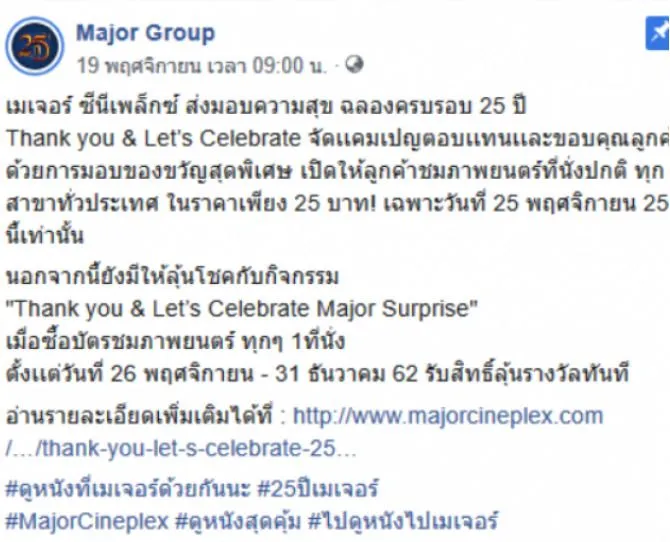 จากที่โรงภาพยนตร์ เมเจอร์ซีนีเพล็กซ์ มอบของขวัญพิเศษฉลองครอบรอบ 25 ปี ขายตั๋วหนังในราคา 25 บาท ล่าสุด ทางด้านเมเจอร์ซีนีเพล็กซ์ ชวนคุณร่วมเฉลิมฉลองความสุขสุดพิเศษ ดูหนังสุดคุ้ม กับแคมเปญ Thank you Let s Celebrate เฉพาะวันที่ 25 พฤศจิกายน 2562 วันเดียวเท่านั้น ลูกค้าซื้อบัตรชมภาพยนตร์ ในราคาพิเศษ 25 บาท
