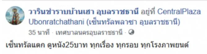 ล่าสุด เพจ วารินชำราบบ้านเฮา อุบลราชธานี ได้โพสต์ข้อความระบุว่า “เซ็นทรัล ดูหนัง25บาท ทุกเรื่อง ทุกรอบ ทุกโรงภาพยนต์”