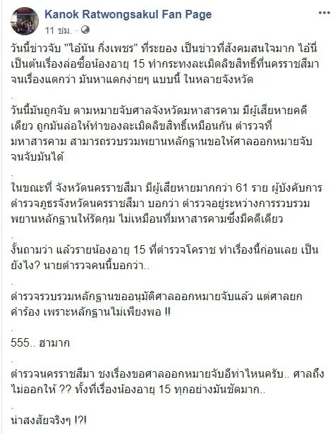 งั้นถามว่า แล้วรายน้องอายุ 15 ที่ตำรวจโคราช ทำเรื่องนี้ก่อนเลย เป็นยังไง? นายตำรวจคนนี้บอกว่า..ตำรวจรวบรวมหลักฐานขออนุมัติศาลออกหมายจับแล้ว แต่ศาลยกคำร้อง เพราะหลักฐานไม่เพียงพอ !! 555.. ฮามาก ตำรวจนครราชสีมา ชงเรื่องขอศาลออกหมายจับอีท่าไหนครับ.. ศาลถึงไม่ออกให้ ?? ทั้งที่เรื่องน้องอายุ 15 ทุกอย่างมันชัดมาก..น่าสงสัยจริงๆ !?!
