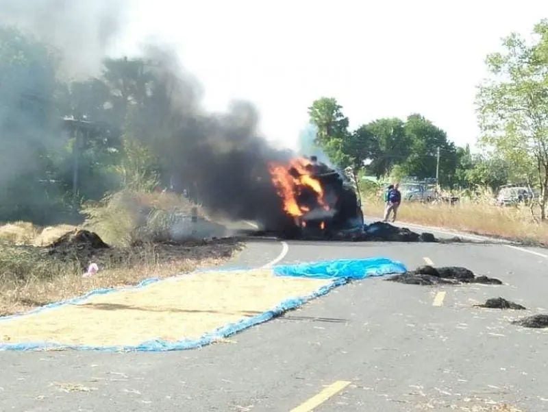 เป็นอีกหนึ่งเรื่องราวที่ถูกแชร์อย่างมาก ผู้ใช้เฟซบุ๊กชื่อ Kanda Choorat ได้มีการโพสต์ภาพข้าวของชาวนา ที่ตากอยู่บนถนน มีเพลิงไหม้ โดยผู้ดพสต์ได้ระบุว่า ก่อนหน้านี้ได้มีรถขนฟางข้าว ขับผ่านมา แล้วก็ได้ไปเกี่ยวเข้ากับสายไฟฟ้า ทำให้ไฟช็อต รถขนฟาง เพลิงไหม้ หลังจากนั้นก้อนฟางก็ได้ตกใส่กองข้าวของชาวนา อย่างที่เห็นตามภาพ โดยเหตุการณ์ดังกล่าวเกิดขึ้นที่จังหวัด ยโสธร ซึ่งหลังจากที่ได้มีการโพสต์ภาพออกไป ก็มีผู้คนในโซเชียลเข้ามาแสดงความคิดเห็นและร่วมแชร์กันอย่างมาก