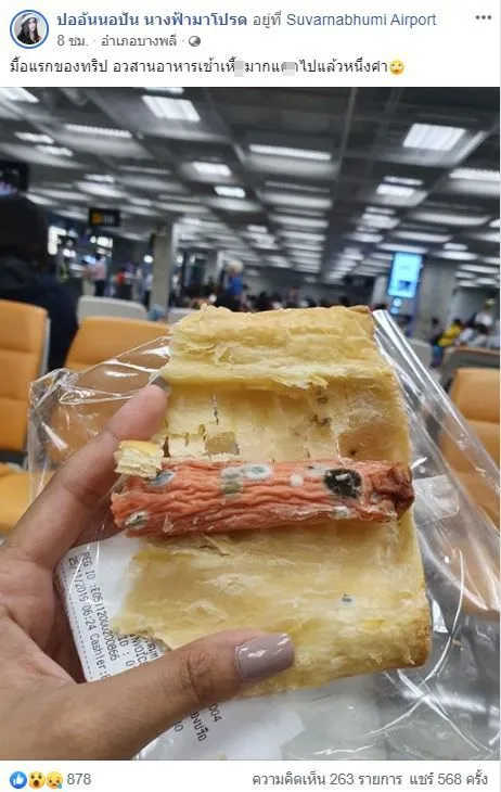 สาวสวยที่ใช้ชื่อเฟซบุคว่า ปออันนอปัน นางฟ้ามาโปรด ได้เลือกกินขนมปังไส้กรอกที่ซื้อจากร้านค้าในสนามบิน ขณะกำลังกัดเข้าไปคำแรกก็รับรู้ได้ถึงความผิดปกติ ลองแหวกดูไส้ข้างในถึงกับขนลุก เพราะไส้กรอกข้างในขึ้นราดำๆเต็มไปหมด
