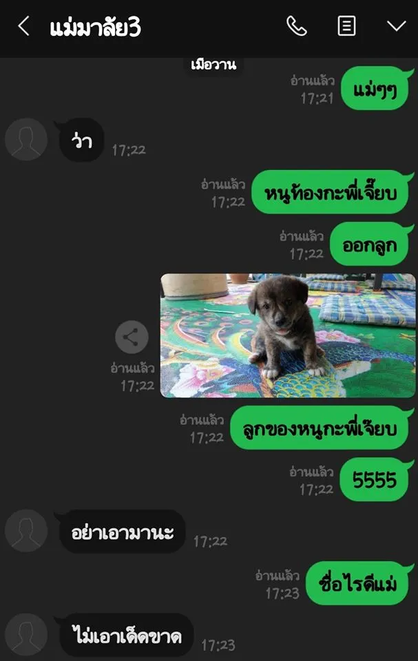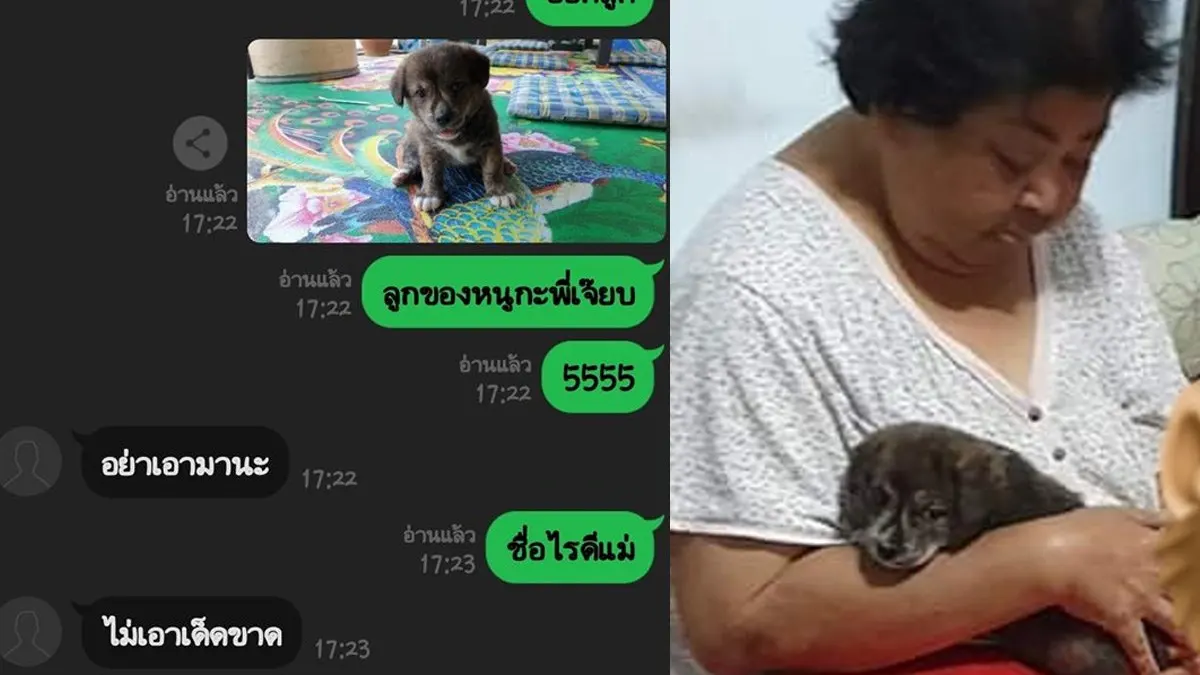 เป็นเรื่องราวความน่ารักของแม่ลูกคู่หนึ่ง เมื่อผู้ใช้เฟซบุ๊ก รัฐชญา ภักดีกุลเจริญ โพสต์ภาพแชทข้อความระหว่างคุยกับแม่ว่ากำลังจะเอาลูกสุนัขมาเลี้ยงในบ้าน ก่อนจะถูกผู้เป็นแม่สั่งห้าม “ไม่เอาเด็ดขาด” แต่สุดท้ายกลับกลายเป็นหนังคนละม้วน