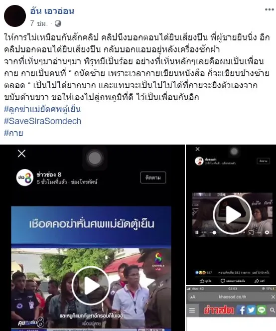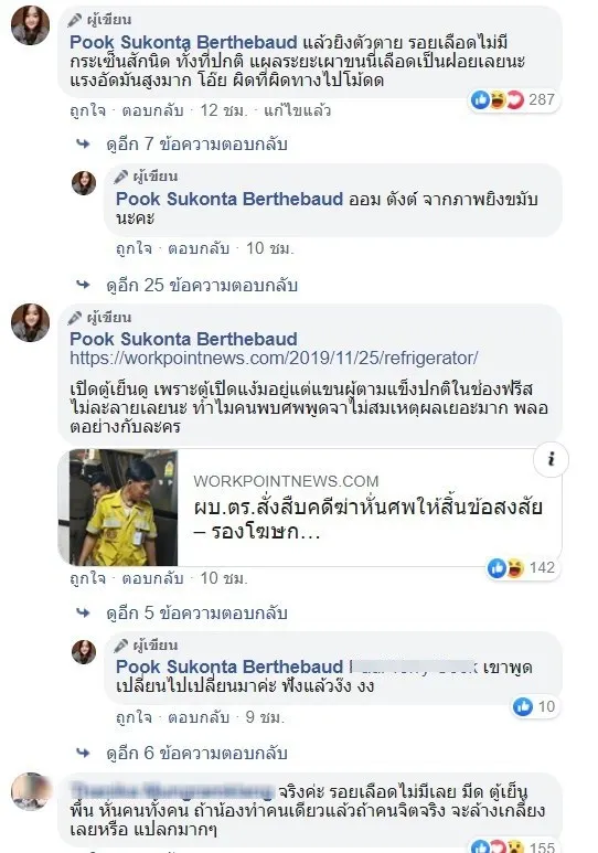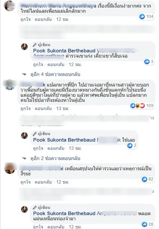 ชาวเน็ตหลายคนต่างแกะรอยคดีที่คิดว่าน่าสงสัยและมีเงื่อนงำ กับคดีลูกฆ่าแม่หั่นศพยัดตู้เย็น หลายคนต่างตั้งข้อสงสัยว่าลูกฆ่าแม่จริงๆหรือไม่? ล่าสุด Pook Sukonta Berthebaud ก็ได้ออกมาโพสท์ตั้งข้อสังเกตเอาไว้ดังนี้ว่า
