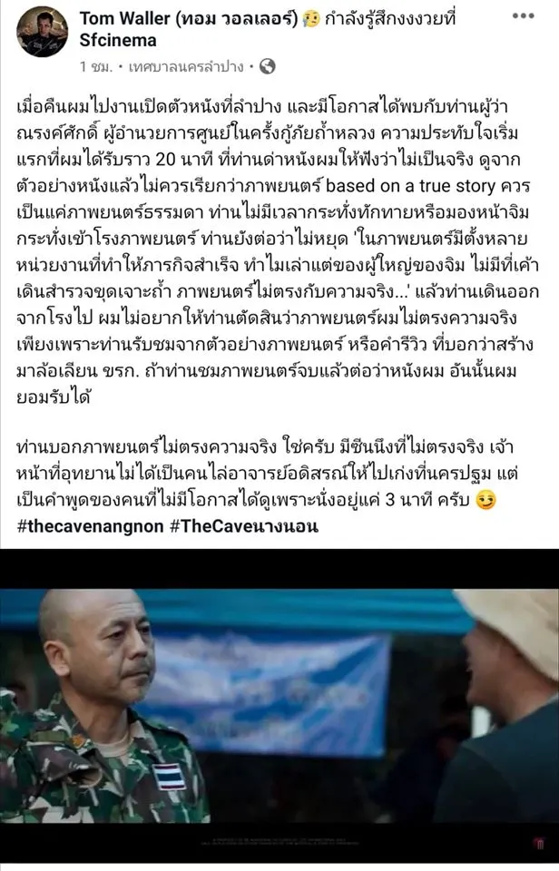 ผกก. หนัง ทอม วอลเลอร์ เขียนเล่าถึงการได้เจอนายณรงค์ศักดิ์ โอสถธนากรที่ห้างเซ็นทรัลลำปางก่อนฉายหนัง 'นางนอน' -ที่เล่าถึงภารกิจช่วยเหลือคนติดถ้ำจำนวน 13 ชีวิตอันโด่งดังเมื่อปีก่อน-