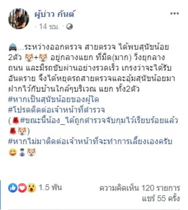 บังเกิดเป็นภาพเรียกรอยยิ้มของผู้คนที่พบเห็นไปตาม ๆ กัน เมื่อได้มีเจ้าหน้าที่ตำรวจผู้ใช้งานเฟซบุ๊กชื่อว่า ผู้บ่าว กันต์ ได้ออกมาโพสต์เผยภาพขณะเข้าอุ้มกระเตงลูกสุนัข จำนวน 2 ตัว ที่บังเอิญผ่านไปพบเดินเร่ร่อนอยู่กลางถนนท่ามกลางความมืด ด้วยความกลัวว่าจะได้รับอันตรายจากรถยนต์ที่ผ่านไป ผ่านมา เกิดมองไม่เห็นแล้วจะชนเอา เจ้าหน้าที่จึงช่วยอุ้มพาน้องทั้ง 2 ตัว มาฝากไว้กับชาวบ้านในระแวกใกล้เคียง พร้อมกับโพสต์ประกาศตามหาเจ้าของที่แท้จริงมารับ โดยได้ระบุข้อความว่า ระหว่างออกตรวจ สายตรวจ ได้พบสุนัขน้อย 2 ตัว อยู่กลางแยก ที่มืดมาก วิ่งอยู่กลางถนน และมีรถขับผ่านอย่างรวดเร็ว เกรงว่าจะได้รับอันตราย จึงได้หยุดรถสายตรวจ และอุ้มสุนัขน้อยมาฝากไว้กับบ้านใกล้ ๆ บริเวณแยก ทั้ง 2 ตัว หากเป็นสุนัขน้อยของผู้ใด โปรดติดต่อเจ้าหน้าที่ตำรวจ ขณะนี้ น้องได้ถูกตำรวจจับกุมไว้เรียบร้อยแล้ว หากไม่มาติดต่อเจ้าหน้าที่จะทำการเลี้ยงเองครับ