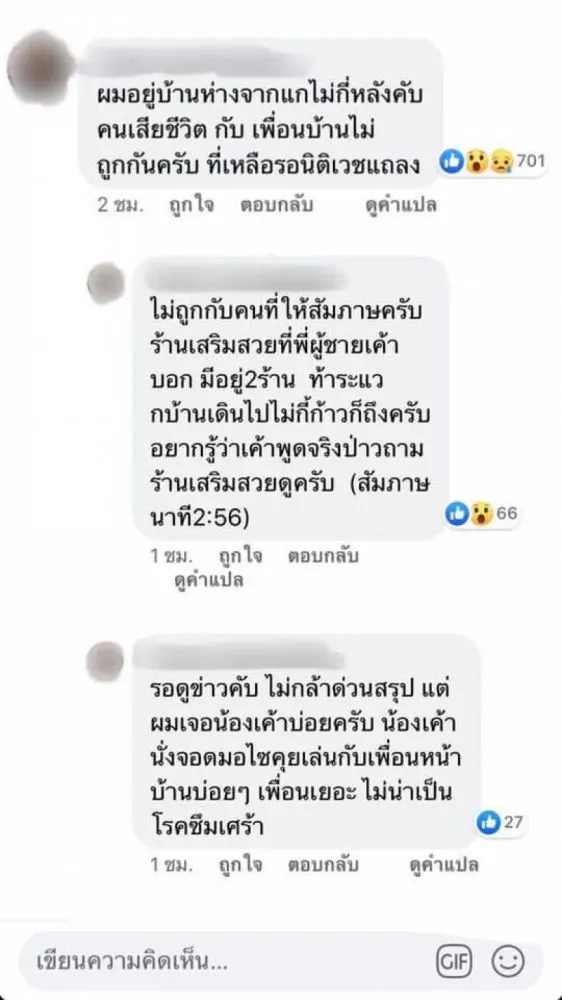 ล่าสุดมีคอมเม้นท์ จากเพื่อนบ้าน ในระแวกนั้นเล่าว่า เพื่อนบ้านที่มาเจอ ไม่ถูกกับบ้านผู้เสียชีวิต และบอกอีกว่า ลูกชายเจ้าของบ้านไม่น่าจะเป็นโรคซึมเศร้า เพราะ เป็นคนมีเพื่อนฝูง คุยกันตลอด