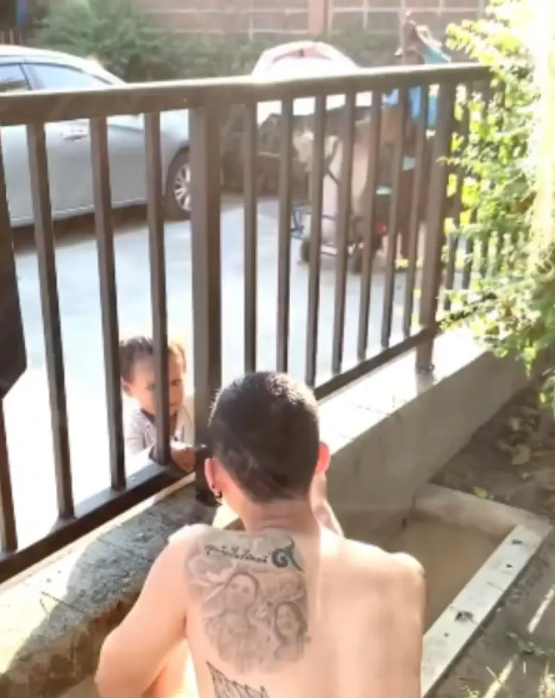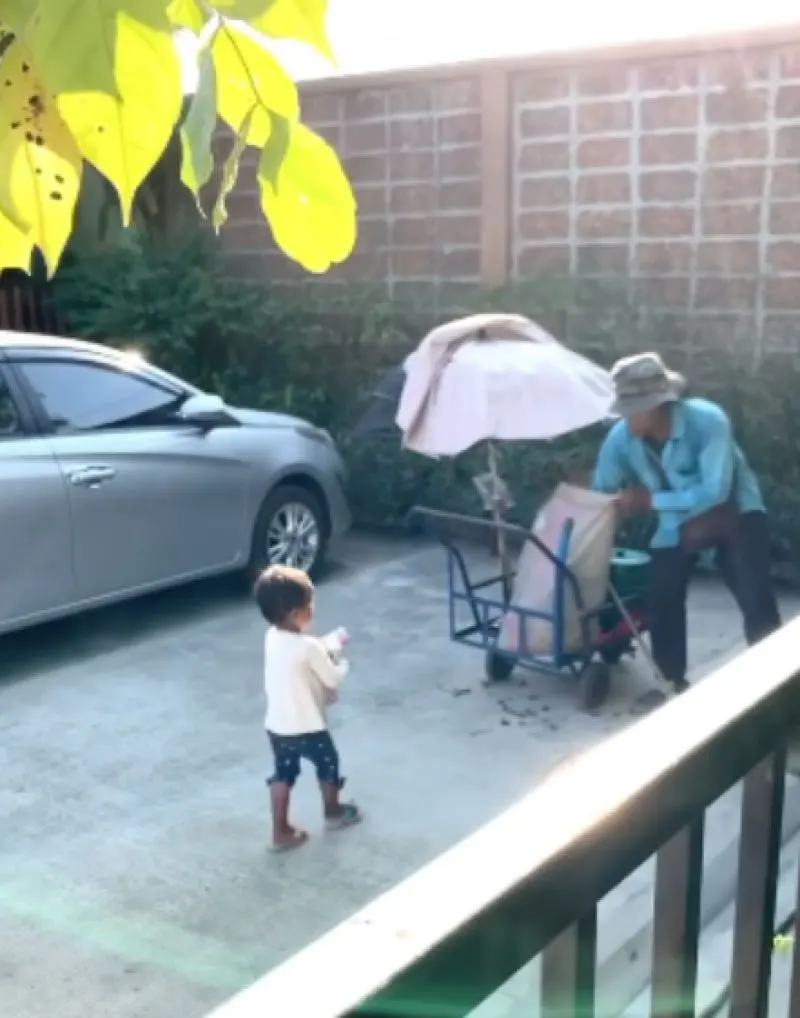 หนูน้อยมากับพ่อกวาดขยะหน้าบ้าน ขอบคุณขนมจาก fc เราแบ่งปันต่อ