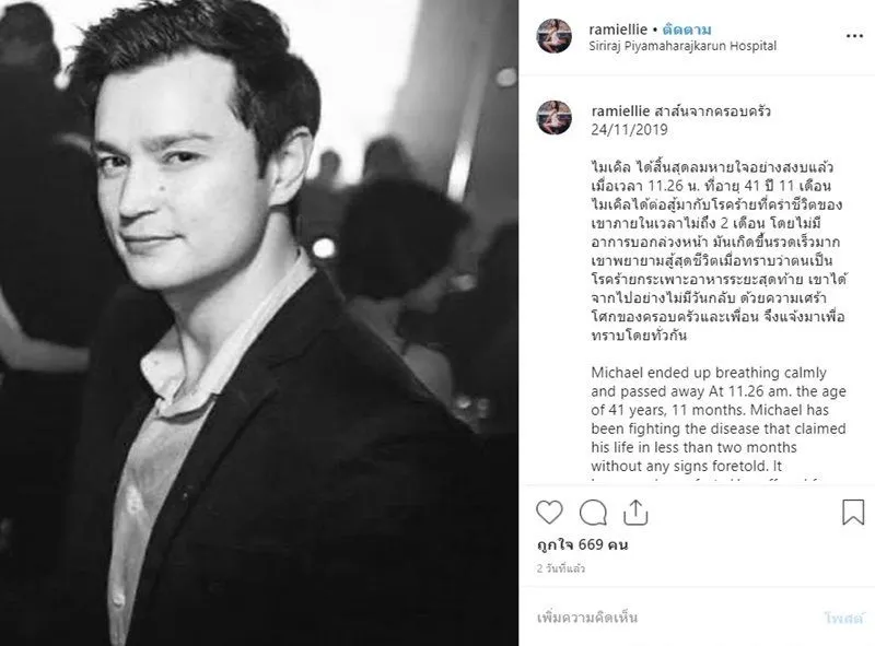 ขณะที่ ไอจี ไมเคิล โพสต์สุดท้าย เมื่อวันที่ 8 ตุลาคม เป็นภาพ ตัวเอง พร้อมภรรยา และลูกชาย พร้อมหน้า ท่ามกลาง แฟนคลับและคนเข้ามาแห่ไว้อาลัย จำนวนมากด้วย