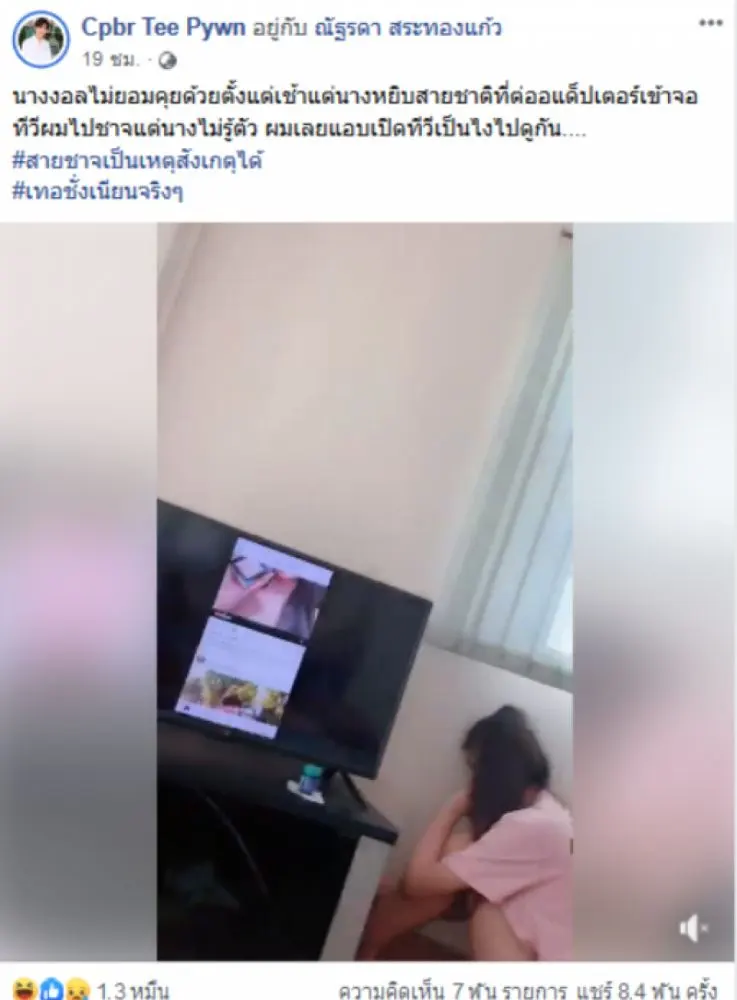 เรียกได้ว่าเป็นคลิปที่มีคนแห่พูดถึง และต่างเข้ามาแสดงความคิดเห็นกันเป็นจำนวนมาก โดยในคลิปจะเห็นได้เลยว่าแฟนสาวนั้นไม่ยอมคุยกับตน นั่นหลบมุมอยู่นานสองนาน จนสุดท้าย ทนไม่ไหว ก็เลยแอบดูเห็นเต็มๆ แหม่ๆแอบดูรูปผู้ชายอยู่นี่เอง เมื่อผู้ใช้เฟสบุ๊คที่ใช้ชื่อว่า Cpbr Tee Pywn ได้โพสต์คลิป พร้อมระบุข้อความว่า นางงอลไม่ยอมคุยด้วยตั้งแต่เช้าแต่นางหยิบสายชาติที่ต่ออแด็ปเตอร์เข้าจอทีวีผมไปชาจแต่นางไม่รู้ตัว ผมเลยแอบเปิดทีวีเป็นไงไปดูกัน สายชาจเป็นเหตุสังเกตุได้ เทอชั่งเนียนจริงๆ