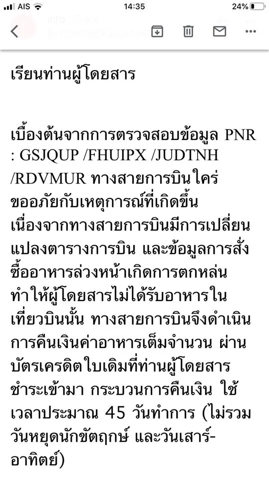 ล่าสุดทางสายการบินออกมาชี้แจงว่า เรียนท่านผู้โดยสาร เบื้องตันจากการตรวจสอบข้อมูล PNR: GSJQUP /FHUIPX /JUDTNH/RDVMURทางสายการบินใคร่ขออภัยกับเหตุการณ์ที่เกิดขึ้นเนื่องจากทางสายการบินมีการเปลี่ยนแปลงตารางการบิน และข้อมูลการสั่งซื้ออาหารล่วงหน้าเกิดการตกหล่นทำให้ผู้โดยสารไม่ได้รับอาหารในเที่ยวบินนั้น ทางสายการบินจึดำเนินการคืนเงินค่าอาหารเต็มจำนวน ผ่านบัตรเครดิตที่ท่านผู้โดยสารชำระเข้ามา กระบวนการคืนเงิน ใช้เวลาประมาณ 45 วันทำการ (ไม่รวมวันหยุดนักขัตฤกษ์ และวันเสาร์-อาทิตย์)